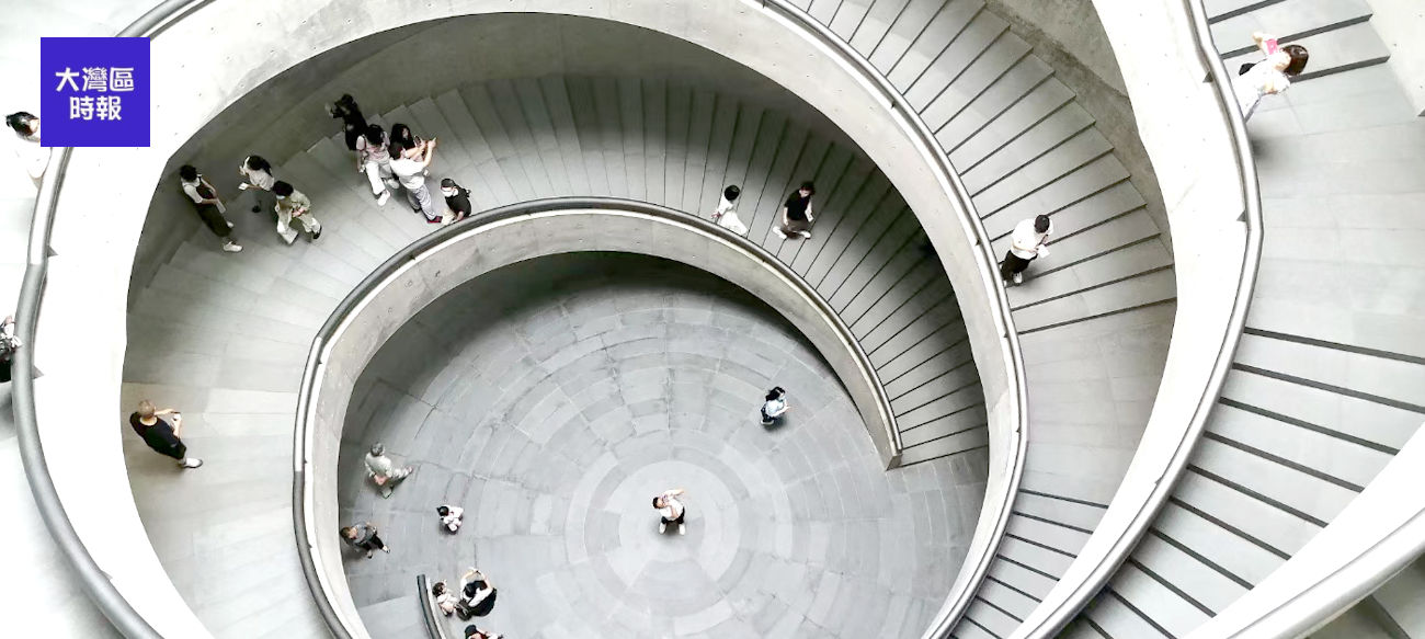走進和美術館,最吸引人的是其一對雙螺旋的樓梯,沿著樓梯爬到四樓便能從上方的天井中沐浴在自然光之下。據悉,這個獨特的設計靈感來源於廣東嶺南當地的建築,利用在高高在上的天窗,代表中國古哲學中「天圓」,天空的光線透過這個天窗滲入下面四方形的展覽區域,展現出「天圓地方」的意念。