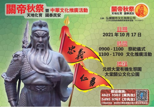 時值深秋,「弘揚關帝文化有限公司」主辦的辛丑年關帝秋祭大典及文化推廣活動,將於十月十七日(星期日)在元市朗大棠有機生態園關公文化公園舉行,歡迎觀禮!