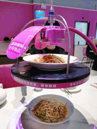 40多部自主研發的機器人在落地玻璃的後廚,一字排開,好像跳舞般炒菜,吸引小朋友駐足觀看,不消一會,熱騰騰的菜餚倒入餐碟,有升降功能的托盤馬上在餐廳屋頂的雲軌道上遊走,去到點餐的餐檯上空,托盤將食物吊下到檯面上空停下來,食客自行取碟,全程完全自動化,不經人手,除充滿科技感外,也保證食物不受污染。